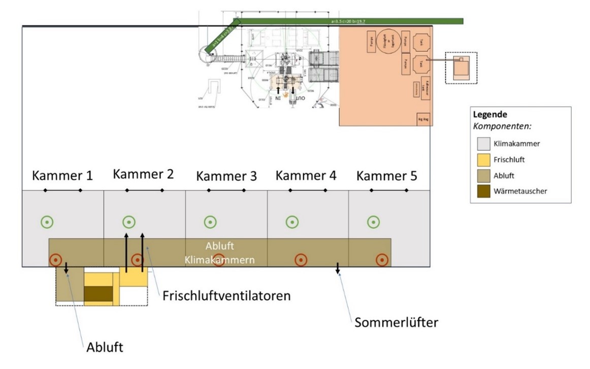 Die Zugänglichkeit der Klimakammern war stark eingeschränkt, sodass Einzelmessungen nur mit hohem Aufwand möglich gewesen wären. Um dennoch belastbare Daten zu erhalten, wurde die Abluft der jeweiligen Kammer über den Sammelkanal umgeleitet. Dies führte zu sehr geringen Strömungsgeschwindigkeiten, die unterhalb der Bestimmungsgrenze der Messverfahren lagen. Der Abluftvolumenstrom musste daher aus dem Betriebsleitsystem übernommen werden.