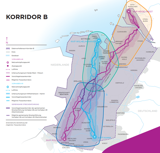 Seit 2021 steht Korridor B mit den beiden Vorhaben Nr. 48 (Heide/West – Polsum) und Nr. 49 (Wilhelmshaven – Hamm) im Bundesbedarfsplan.
